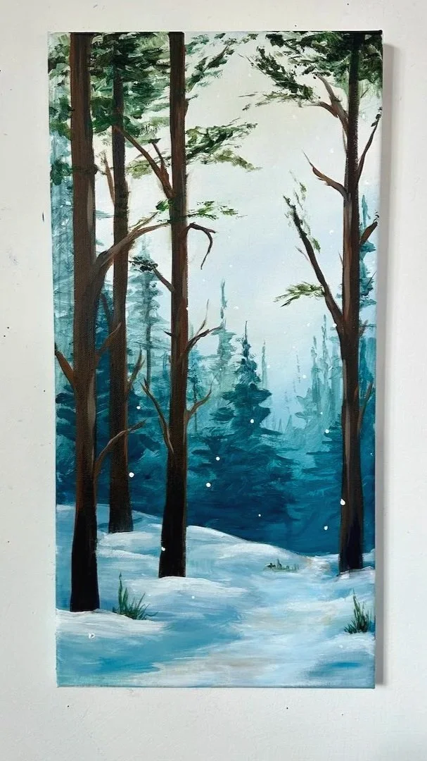 Learn to paint serene winter path on a dramatic 10x 20 canvas with step-by-step instruction, no experience needed.